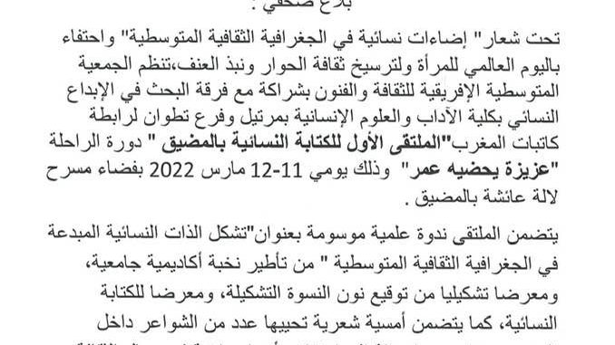الملتقى الاول للكتابة النسائية بالمضيق مارس 6, 2022 Ahmed El Mrini أنشطة, غير مصنف 0 المجلة المغربية للدراسات الإنسانية Post Views: 1٬531 الملتقى الاول للكتابة النسائية