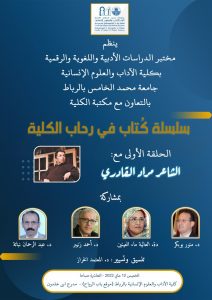 ضمن أنشطة مختبر الدراسات الأدبية واللغوية والرقمية بكلية الآداب والعلوم الإنسانية بالرباط، وبتعاون مع مكتبة الكلية، ستنظم الحلقة الأولى من سلسلة “كُتاب في رحاب الكلية” التي سيتم خلالها استضافة الشاعر مراد القادري، وذلك يوم الخميس 12 ماي 2022 ابتداء من الساعة العاشرة صباحا بمدرج ابن خلدون في كلية الآداب والعلوم الإنسانية الرباط (موقع باب الرواح).
