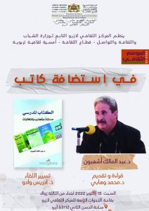 في إطار انشطته الثقافية السنوية ذات الطابع الإشعاعي، ينظم المركز الثقافي لمدينة آزرو أمسية ثقافية تربوية خصصت لتقديم الكتاب الجديد للدكتور عبد الملك أشهبون : “الكتاب المدرسي. مسارات وتجارب وانتظارات”، وقد تكلف بتقديم الكتاب الباحث التربوي والناقد الدكتور محمد وهابي، كما سيقوم بتسيير اللقاء الأستاذ إدريس وادو، وذلك يوم السبت 15 أكتوبر 2022، ابتداء من الساعة الثالثة زوالا، بقاعة الندوات التابعة للمركز الثقافي لأمدينة آزرو…