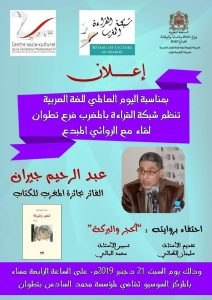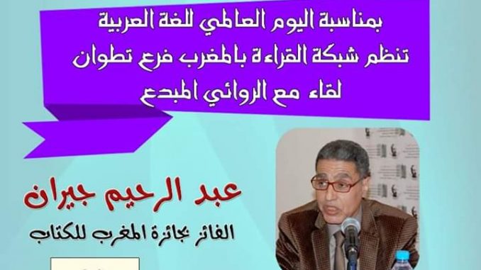 المجلة المغربية للدراسات الإنسانية نظمت شبكة القراءة بالمغرب فرع تطوان اخيرا أولى لقاءاتها الافتتاحية للموسم الدراسي 2019/2020 بمناسبة اليوم العالمي للغة العربية احتفاء بالروائي عبد الرحيم جيران الفائز بجائزة المغرب للكتاب عن روايته الحجر والبركة؛
